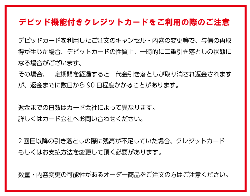 印刷込みオーダーの場合は、印刷OKのご返事を頂く際に最終的な数量を直接メールでご連絡ください。 尚、ご注文時点にてカード決済頂いた場合でも、出荷時に金額変更がある場合において、お客様のご利用カードがその間に利用停止等の措置がなされた場合、金額変更はできません。 その場合、差額分をお振り込みによるお手続きにてご対応いただく場合がございますので、予めご了承くださいませ。 また、減額になった場合においても、ご返金のお手続きの際のお振り込み手数料はお客様ご負担となりますので、ご注意ください。 ![]() PayPay決済